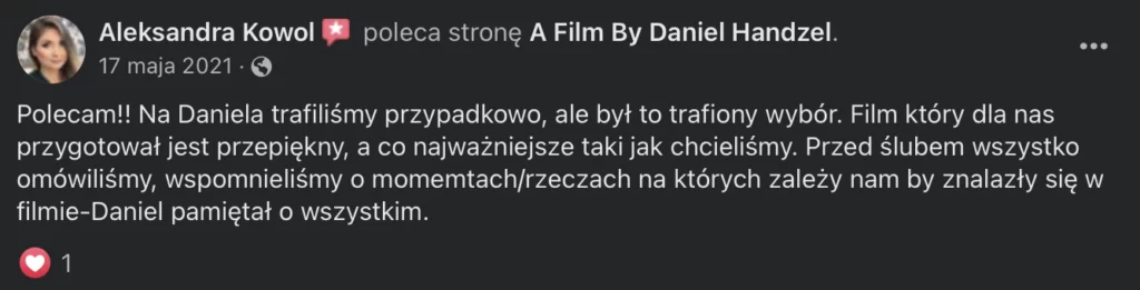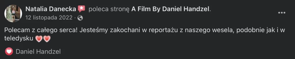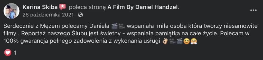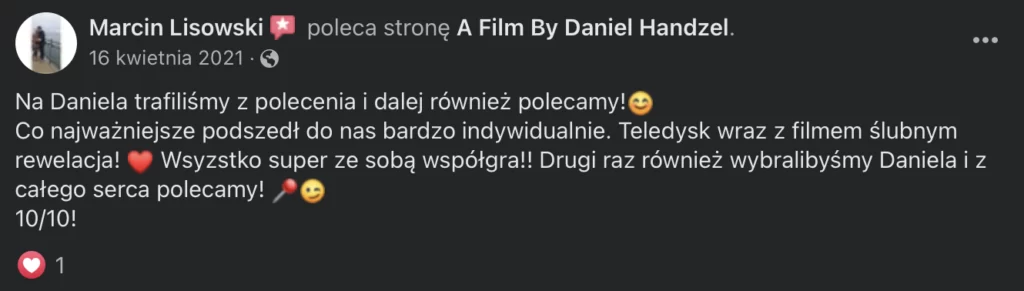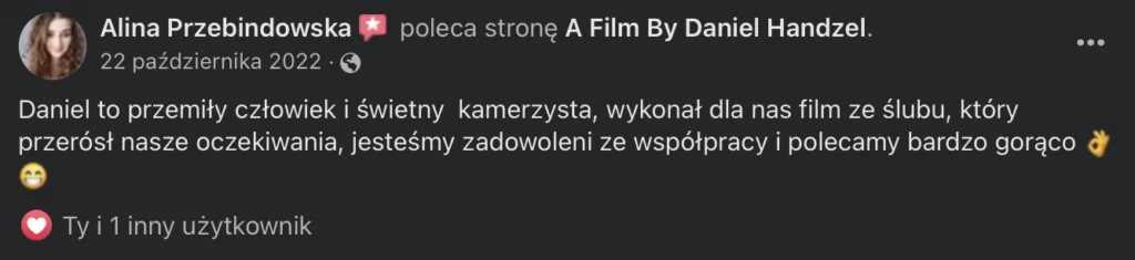 W dniu ślubu nie tylko skupiam się na uwiecznieniu ważnych dla Was chwil, ale także pomagam, doradzam i staram się rozładować nadmierny stres. Nie raz udało mi się też uratować życie Pana Młodego, gdy podczas przygotowań zapomniał powiesić marynarkę na swój dedykowany wieszak specjalnie zakupiony przez jego przyszłą Żonę. Specjalizuję się w reportażach. Moje pary uwielbiają do nich wracać. Uważam, że nie sztuką jest wykonać ciekawy i dopracowany kilkuminutowy teledysk. Natomiast sporo dłuższy reportaż już tak.